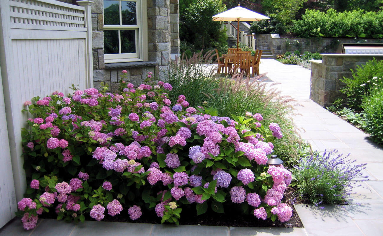 With its large, round clusters of flowers in shades of pink, blue, and purple, the deciduous shrub known as Mophead hydrangea is an excellent choice for walkways, as it adds a bold and colorful statement to any landscape.
