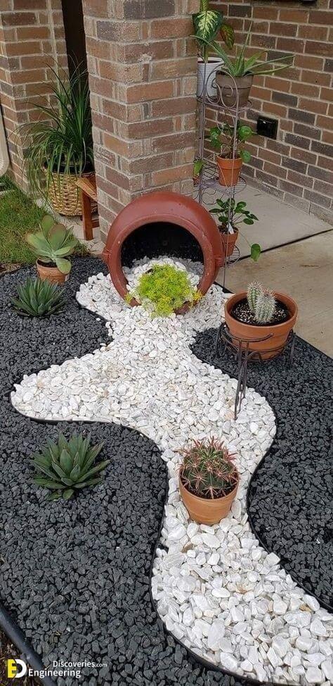 It brings a gentle, natural, and aesthetically captivating approach to enhancing your front yard. By integrating carefully arranged rocks, gravel, and a modest water fountain, you create a serene and inviting outdoor space that not only enhances your curb appeal but also provides a tranquil focal point that exudes charm and serenity.