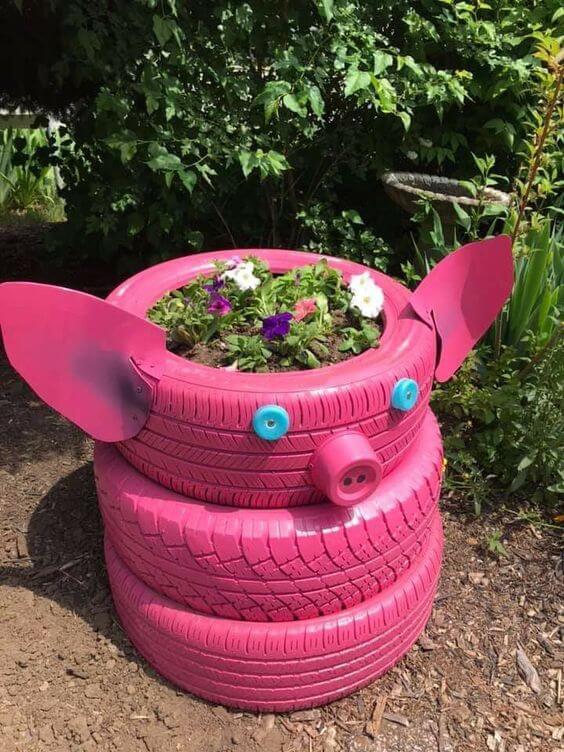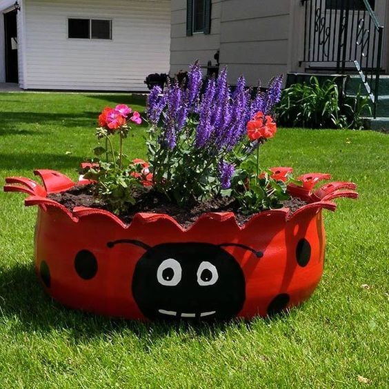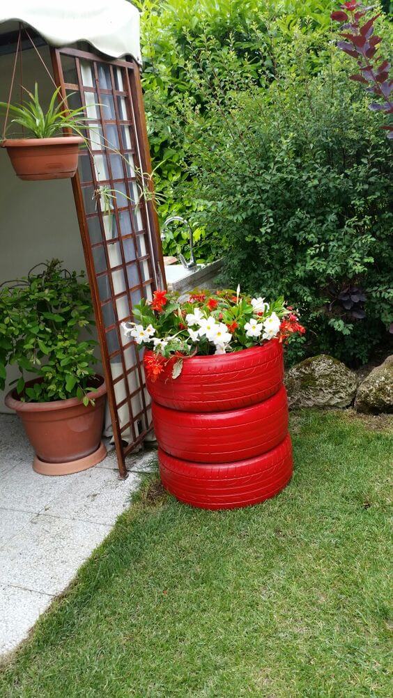 Materials you’ll need: three or more old tires (of different sizes), spray paint in your chosen colors, gloves, mask, goggles, potting soil, plants, or flowers. Thoroughly clean the old tires to remove dirt. pray paint the tires with vibrant colors to create a striking appearance. Allow the paint to dry completely. Stack the painted tires on top of each other. Fill each tire with potting soil and plant your chosen flowers.