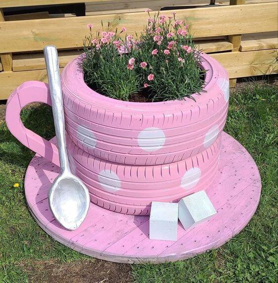 Materials you’ll need: two old tires, pink spray paint, soil and your choice of plants or flowers, gloves, mask, and goggles. You can make this idea like the steps of image 1. For creating the teacup handle, you can use a curved piece of metal, wood, or plastic. Paint it pink and attach it securely to the smaller, top tire to mimic the handle of a teacup.