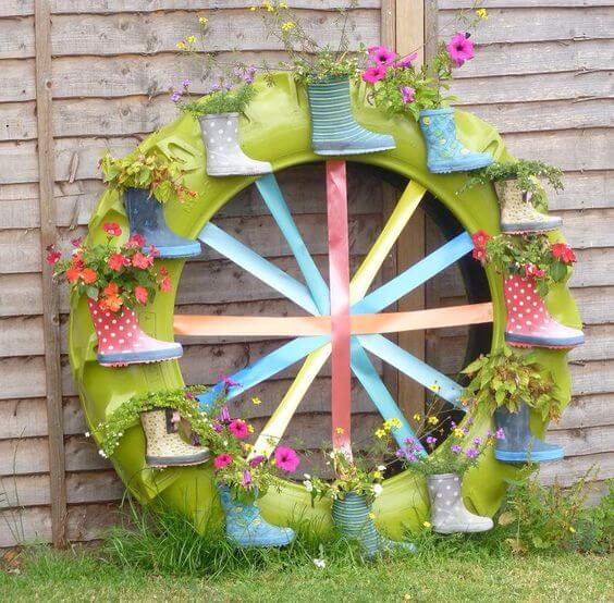 Take an old tractor tire, paint it a soft color, and use it as a backdrop for upcycled miniature rubber boots filled with lovely flowers. Secure the boots to the tire with nails or small pieces of wood. It’s a delightful and eye-catching display, especially for kids.